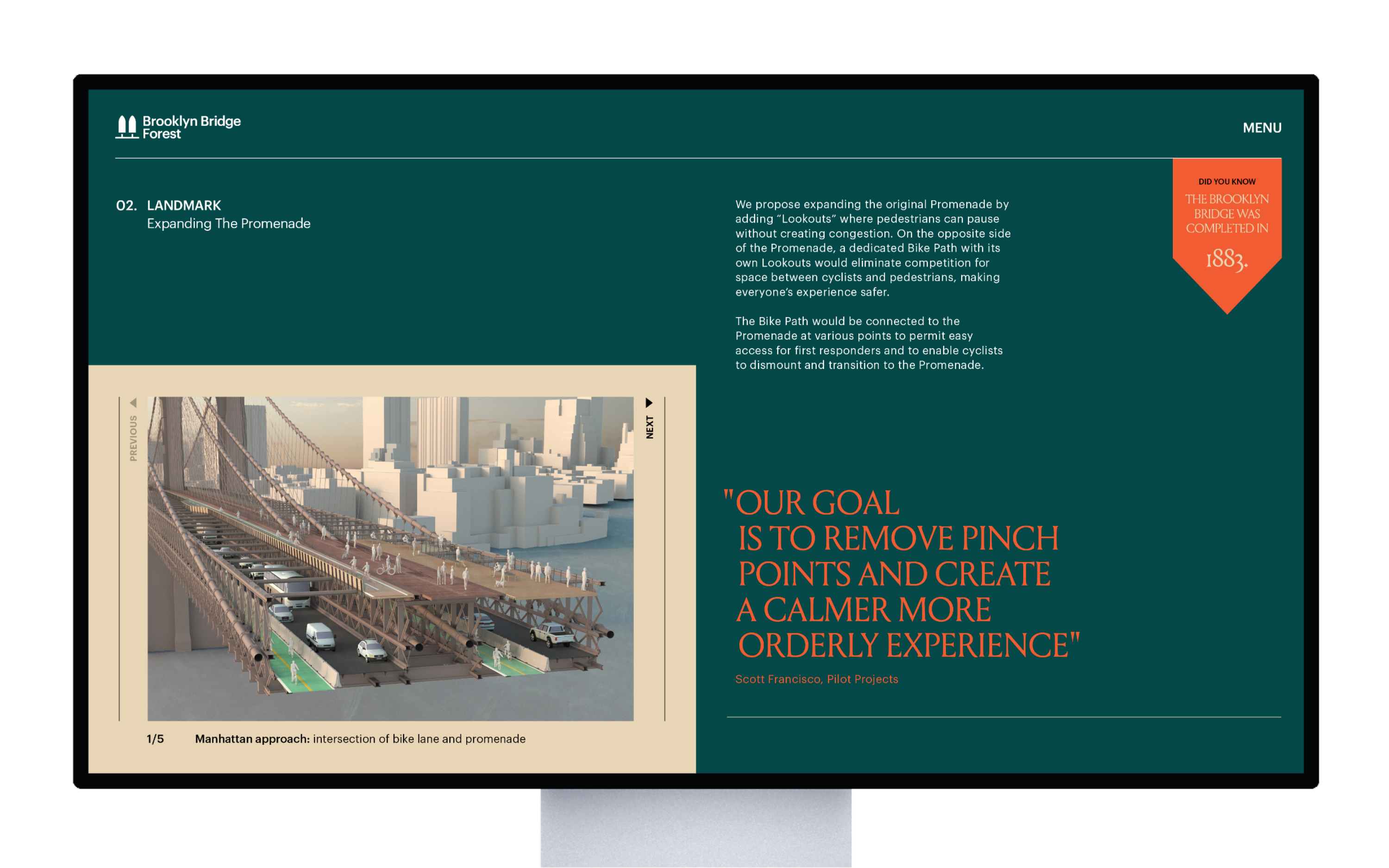 Brooklyn Bridge Forest is a mission-driven collaborative project focused on transforming and expanding one of New York’s most iconic thoroughfares with purposeful public greenspace. This reimagination stands to enhance the world-renowned landmark through an expansive promenade, improved laneways, community programming, sustainability initiatives, and an international partnership that will help permanently protect 200,000 acres of precious rainforest.